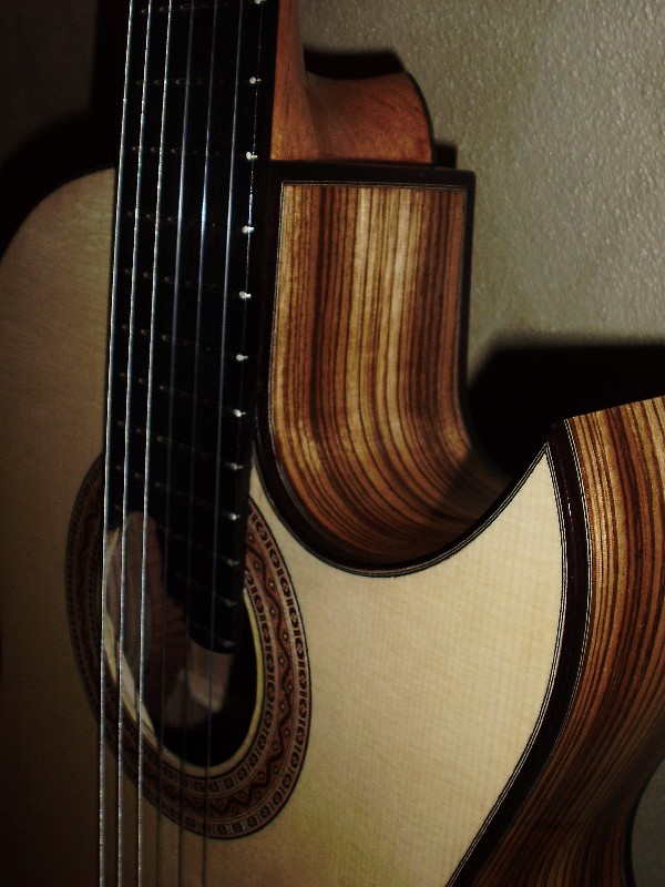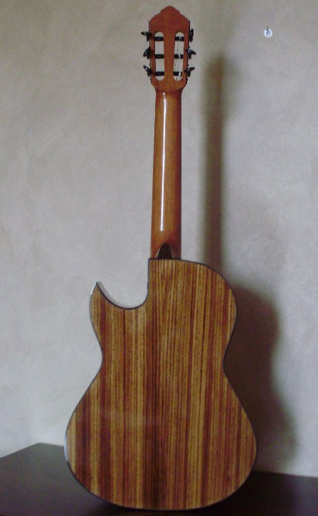 Ed ora vi presento una chitarra nata da un esperimento sulla disposizione delle catene. I legni non sono i classici utilizzati per la costruzione di una chitarra classica da concerto o flamenco, siccome il mio scopo era capire l'effetto e la resa di questa mia idea, ho utilizzato per fasce e fondo dello zebrano, un legno molto fibroso e contenete bassi valori di umidità. Praticamente un legno secco , molto difficile da lavorare e che ha la particolarità di smorzare le frequenze basse.