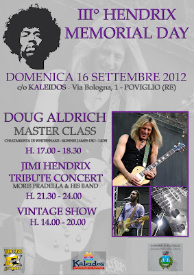 Il conto alla rovescia degli appassionati di musica rock è partito per il prossimo 16 settembre 2012, quando il chitarrista hard rock e leader dei Whitesnake Doug Aldrich sarà a Poviglio per la Terza edizione dell’ “Hendrix Memorial Day”. Un evento da non perdere, anche perché quella del musicista sarà l’unica tappa italiana: dopo Poviglio, Aldrich suonerà direttamente al Wembley Stadium di Londra.