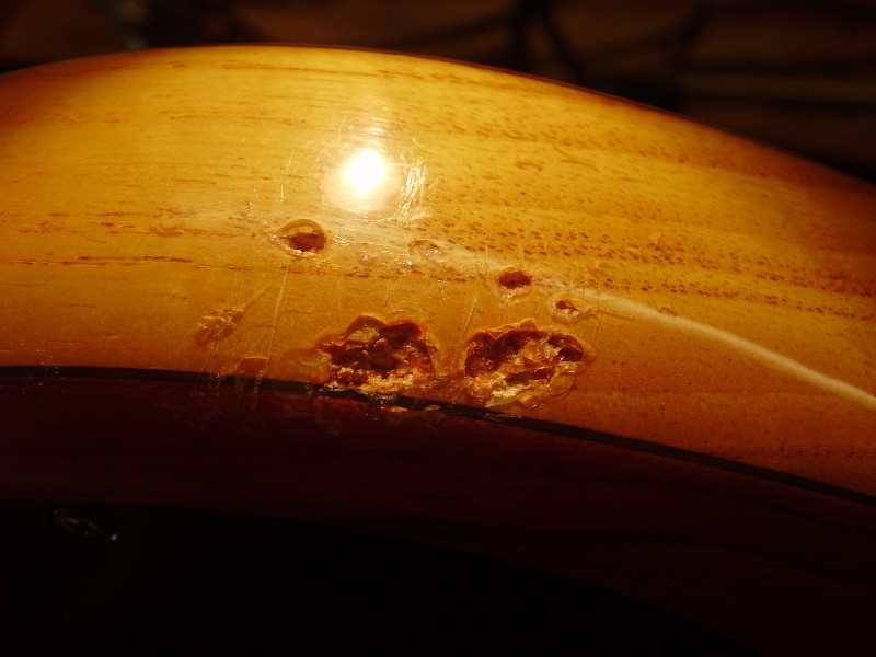 Dopo avere rimosso i materiali estranei tipo polveri, cristalli di vernice e sedimenti vari, per i buchi piccoli ho utilizzato polveri di legno con tonalità scure verso il centro e man mano più chiare verso il perimetro del buco fino a raggiungere il colore naturale del legno, in modo da sembrare dei piccoli nodi . I due buchi grossi li ho fatti rientrare all'interno di una sagoma trapezioidale , e li ho chiusi con un pezzo di legno dello stesso colore del body.Ovviamente solo questo non è sufficiente per quanto i buchi siano stati riparati, ora il secondo passo è la verniciatura e far si che la parte implicata sia un' imperfezione naturale del legno