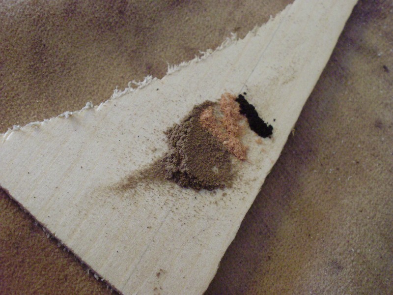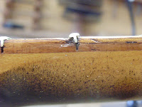 Per riempire la crepa ho utilizzato delle polveri di legno della stessa essenza di quello adoperato per la tastiera aggiungendo però anche una aliquota di ebano e un pizzico di palissandro brasiliano chiaro in modo da esaltarla perchè fortunatamente la sua propagazione inganna bene l'occhio in quanto segue le venature naturali del legno