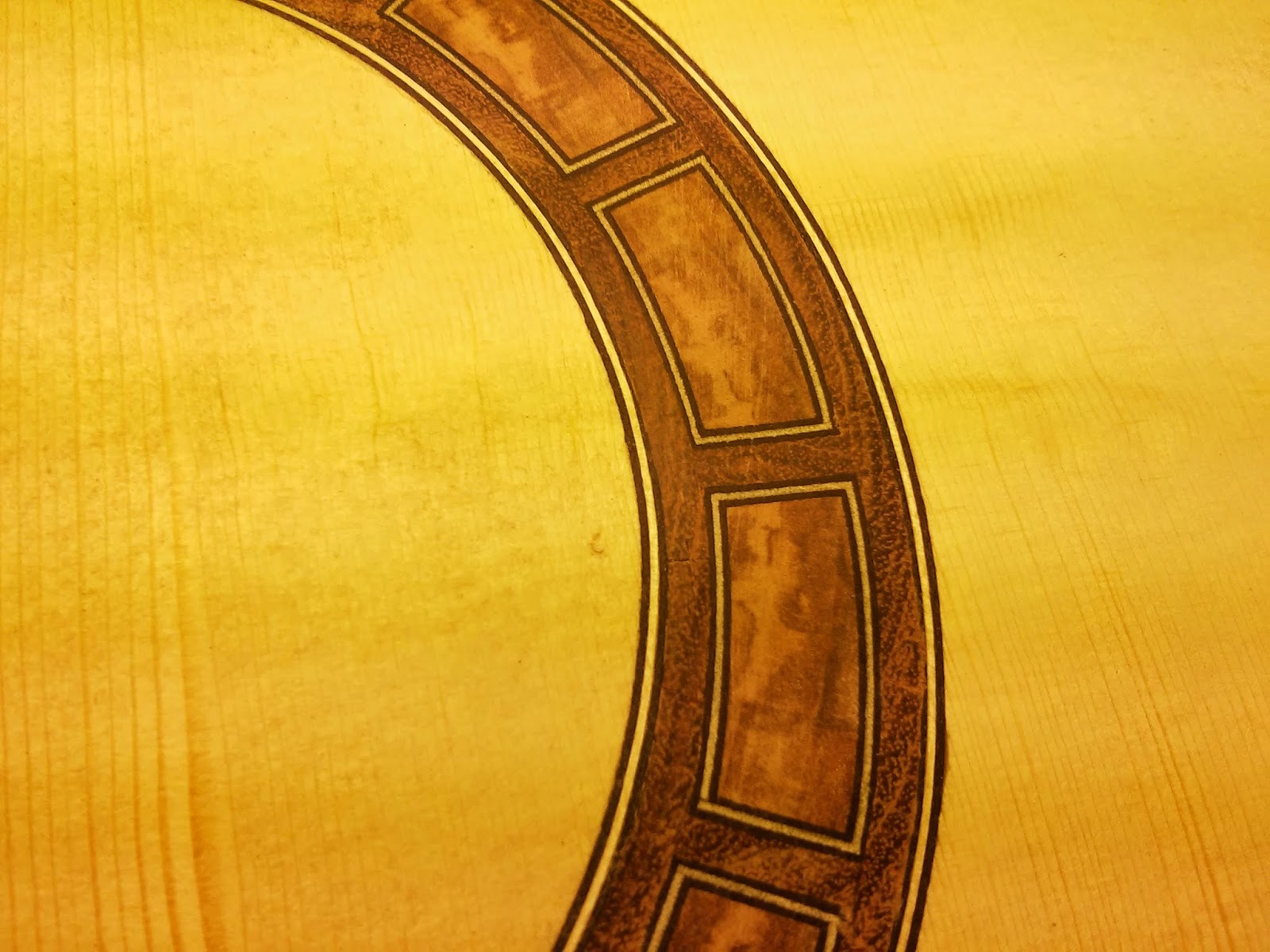 nella foto successiva un dettagli della rosetta sulla tavola in abete e con gli intarsi in koa.