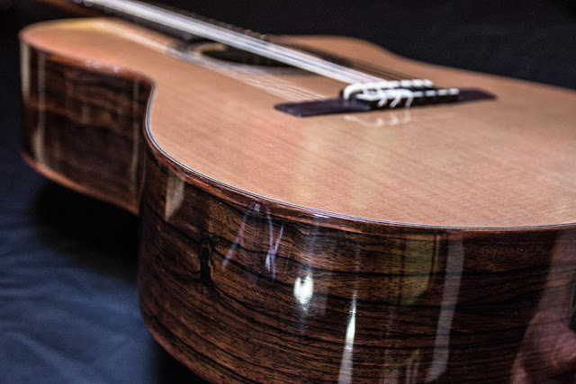 Il suono ha un immediatezza sorprendente, avvolgente e caldo ma nello stesso tempo con sustain ridotto, una chitarra per eseguire performance di alto livello tecnico. La verniciatura è alla nitrocellulosa, Ne applico sempre un film molto sottile , per cui è molto delicata ma il vantaggio è che la resa acustica è elevata ( la vernice fa da sordina )