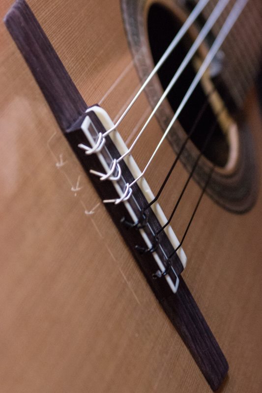 Tavola armonica è in cedro mentre il ponte è in palissandro, da come si può intuire dall'immagine, il ponte è alto solo 7 mm e la tavola armonica è stata incatenata in trazione. Questo consente di avere le corde molto più vicine alla buca, in questo modo dalla cassa armonica verranno percepite e quindi riproposte anche le sfumature poco udibili. Ottenendo un suono più completo e dalla gamma di frequenze più ampia.