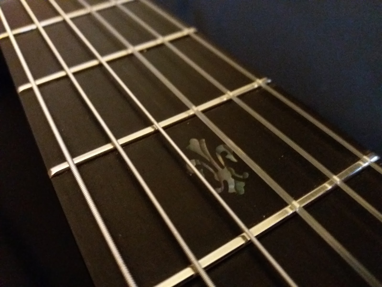 La chitarra monta un sistema di amplificazione Carlos double mic. Il manico in cedrella ha un anatomia ergonomica , la larghezza al capotasto è 48.5 mm mentre sulla tastiera al 5° tasto ho intarsiato un ulteriore giglio in madre perla.
